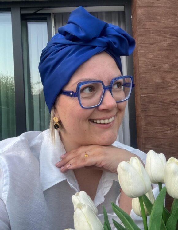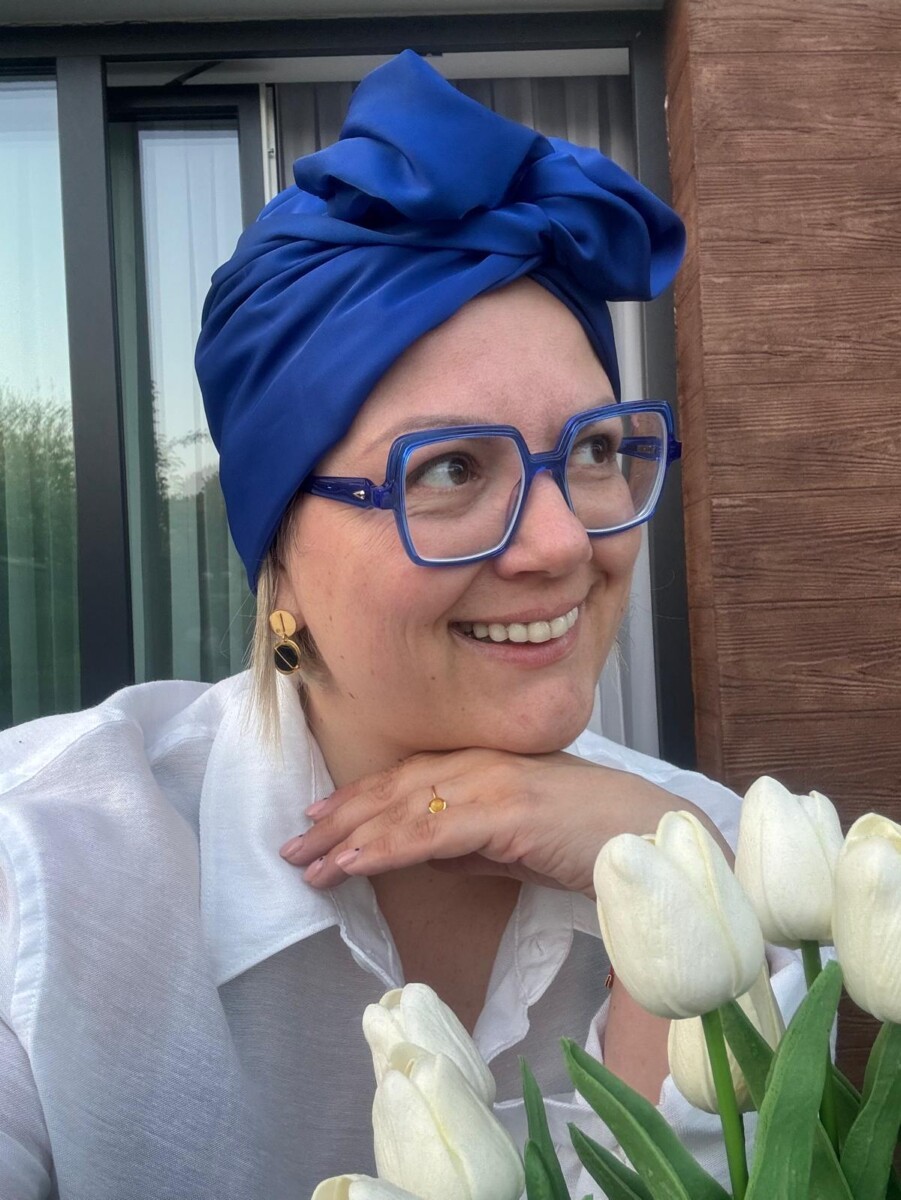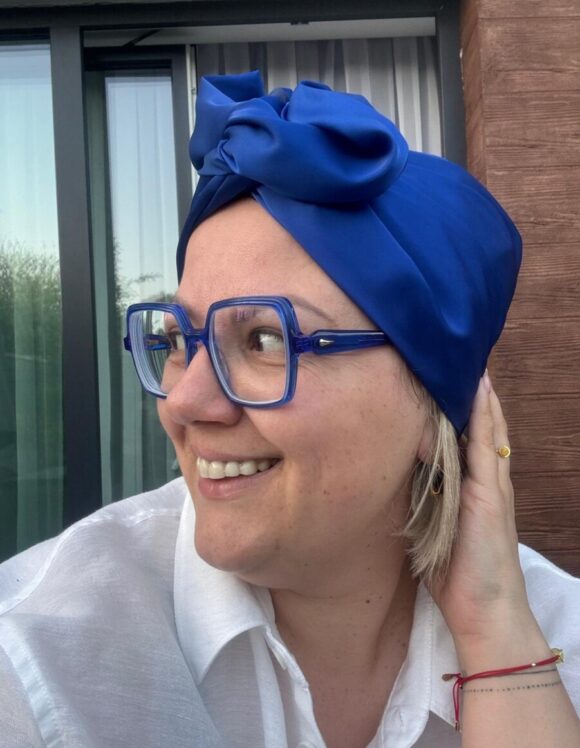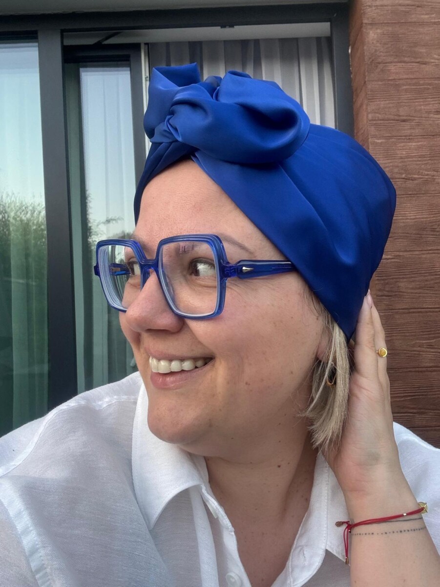 Turban uszyty z luksusowego szyfonu z domieszką naturalnego jedwabiu w intensywnym chabrowym kolorze to kwintesencja elegancji i wyrafinowanego stylu. Jego gładka, lekko połyskująca tkanina pięknie układa się na głowie, dodając szyku każdej stylizacji. Idealny wybór dla osób ceniących połączenie komfortu z ponadczasową klasą.