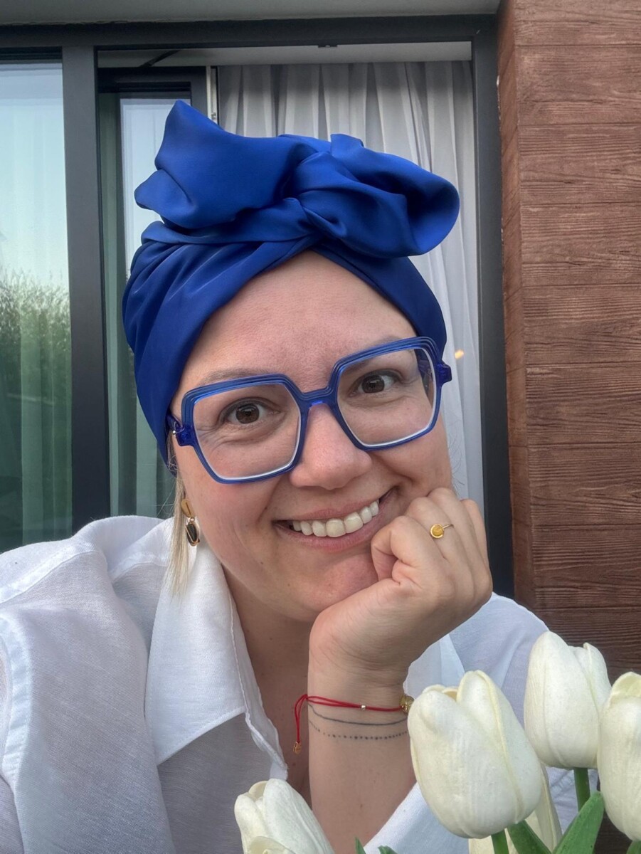Elegancki turban uszyty z szyfonu z domieszką naturalnego jedwabiu – zwiewny, miękki i delikatny.