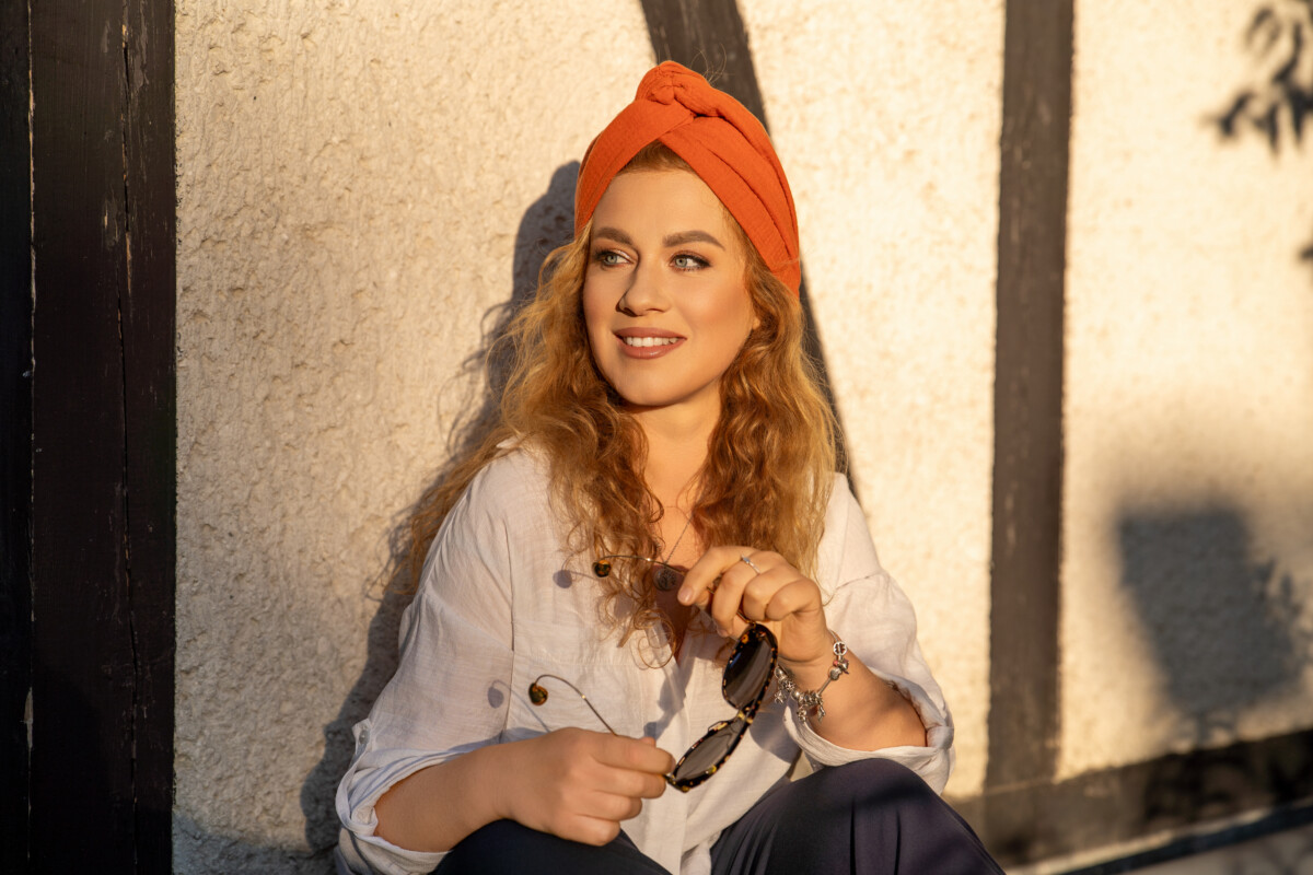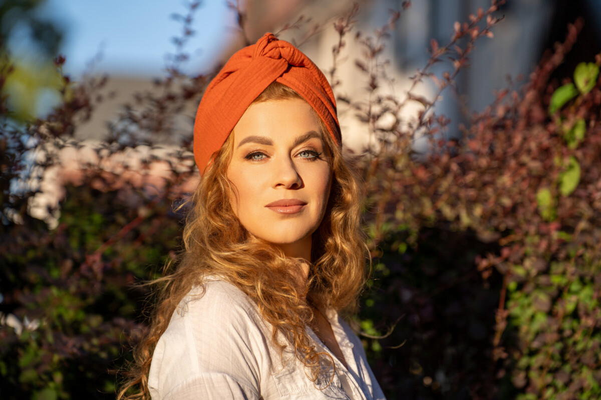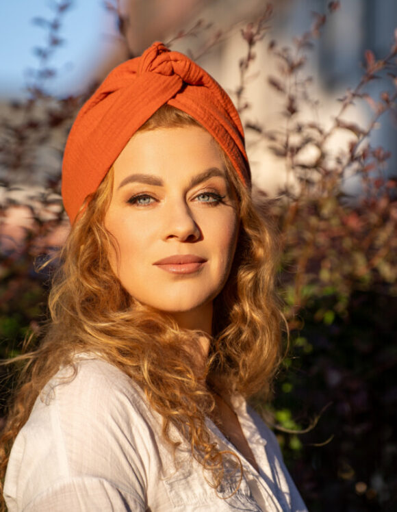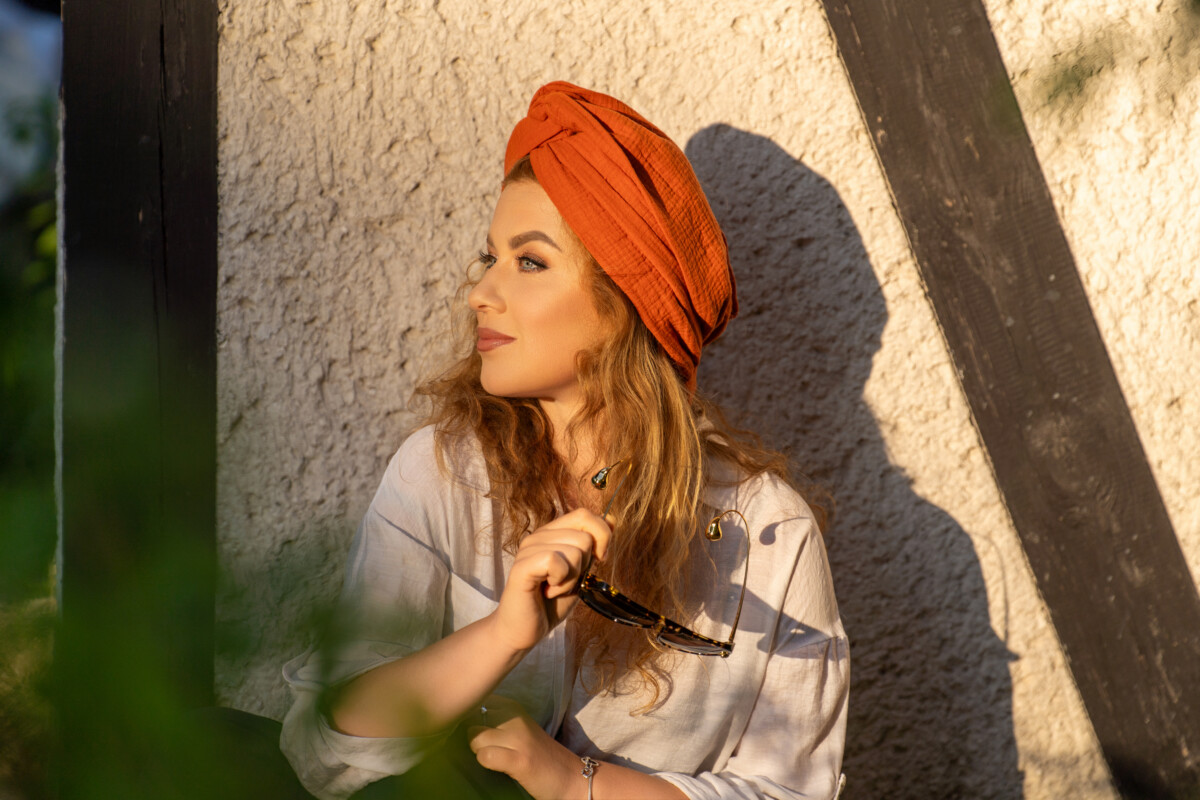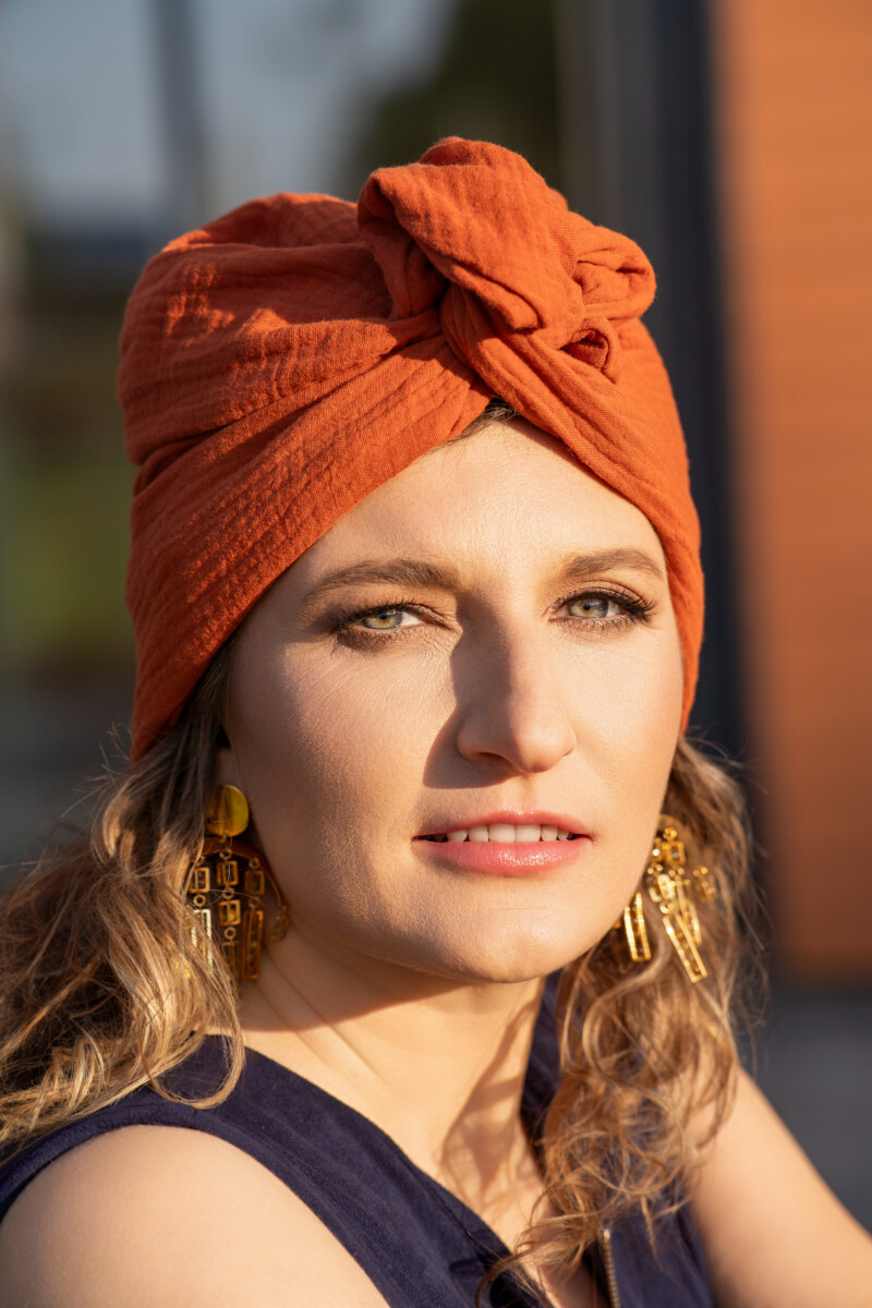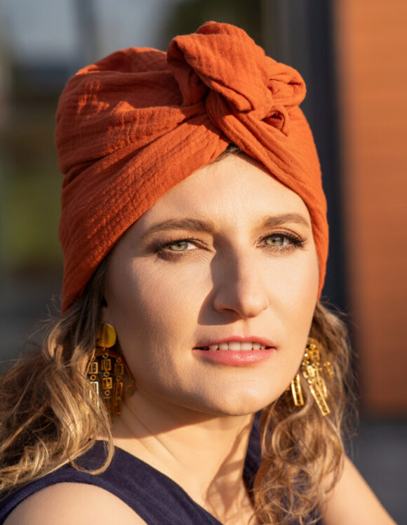 Turban uszyty z muślinu w głęboko ceglanym kolorze. Tkanina ta doskonale pochłania gromadzącą się na skórze wilgoć, dzięki czemu zapewnia komfort noszenia latem. To szczególnie ważne w przypadku posiadaczy wrażliwej skóry.