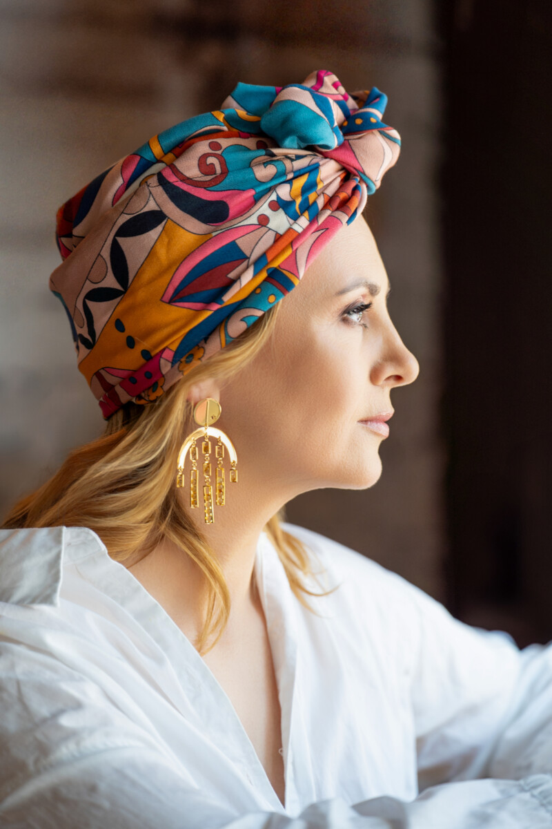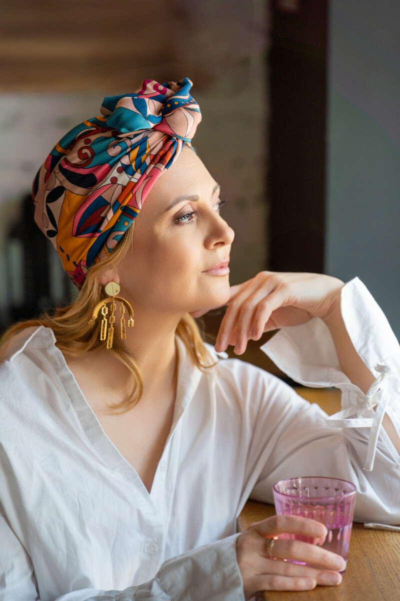 Pastelowe kolory nadają turbanowi delikatność i kobiecość zarazem.