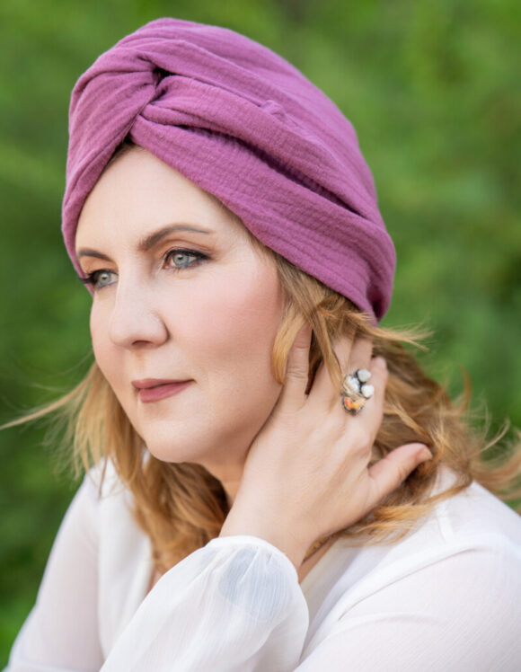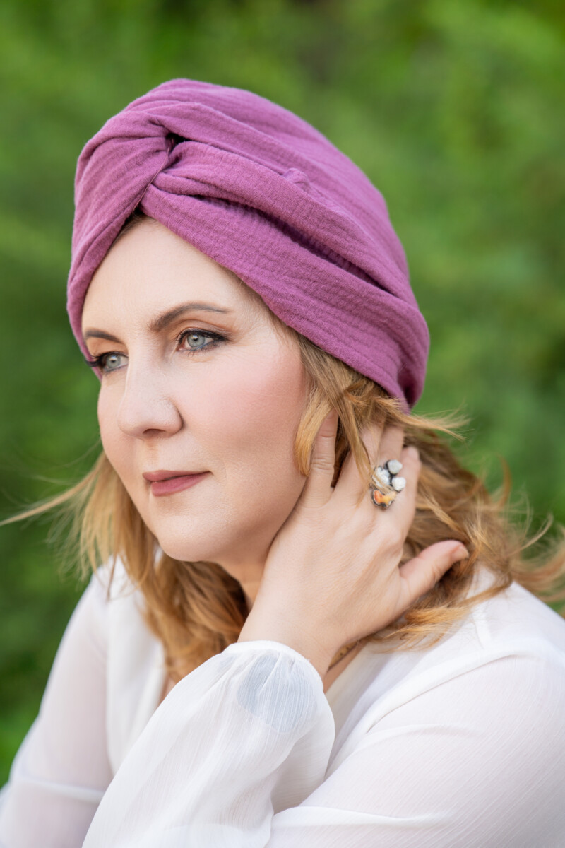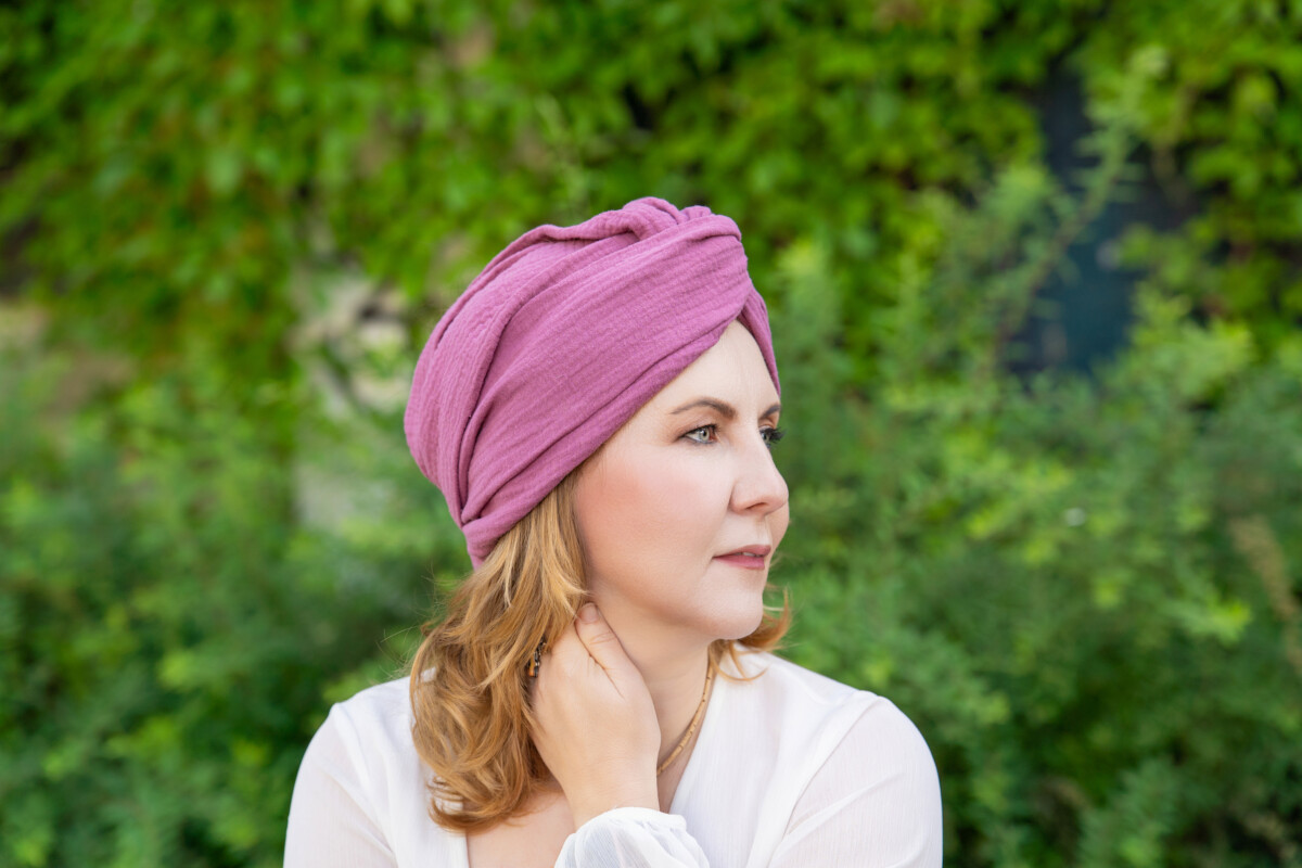 Turban wykonany z lekkiego, przewiewnego muślinu to kwintesencja komfortu i delikatności. Jego miękka struktura pozwala skórze oddychać, zapewniając uczucie świeżości nawet podczas upalnych dni. Subtelny fason i naturalny materiał sprawiają, że turban