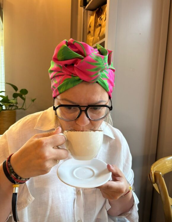 Turban w delikatnym różowym kolorze ozdobiony zielonym liściem monstery to świeże i dziewczęce połączenie natury z subtelną elegancją. Miękka tkanina doskonale dopasowuje się do kształtu głowy, zapewniając komfort i lekkość noszenia. Idealny dla osób, które cenią modne, a zarazem naturalne wzory z nutą tropikalnej energii.