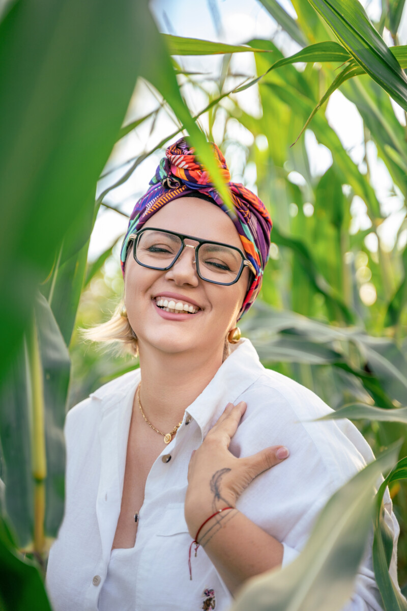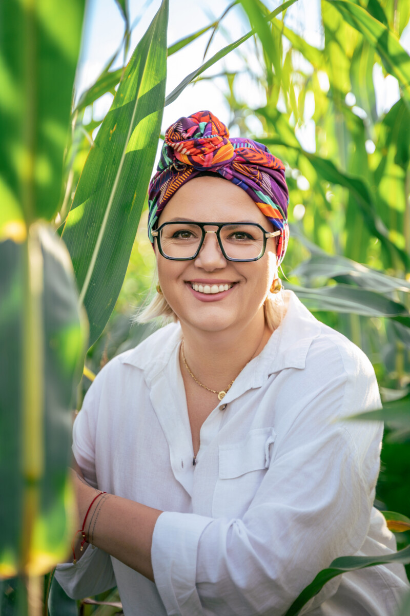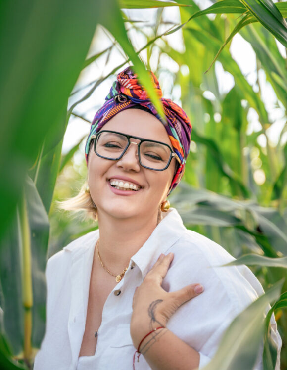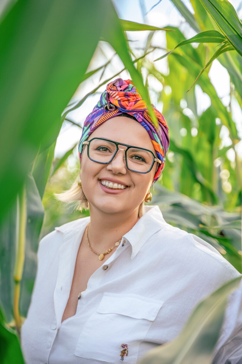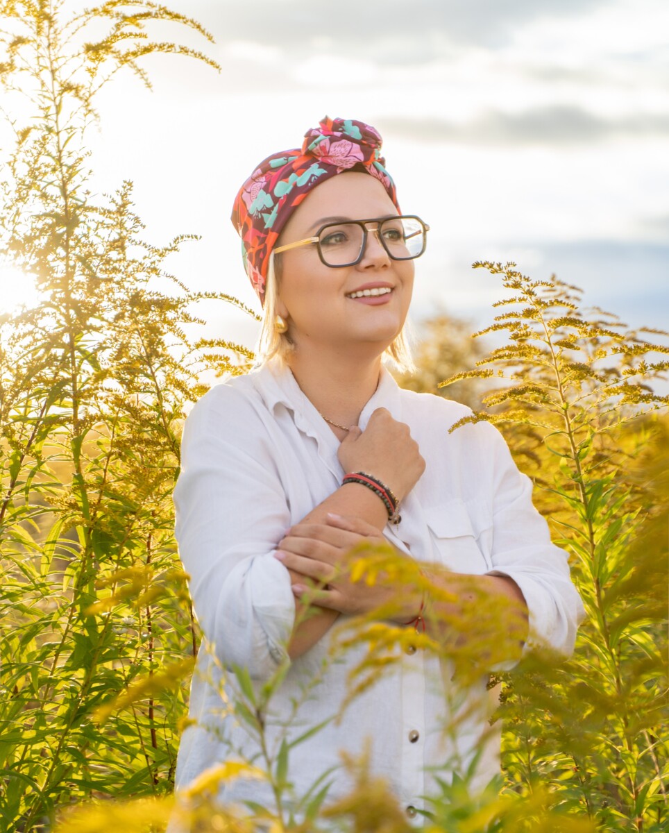 Turban uszyty z dzianiny wiskozowej z dodatkiem elastanu w kolorze głębokiego fioletu, ozdobiona kolorowym, roślinnym wzorem, który dodaje turbanowi wyjątkowego charakteru i subtelnej energii.