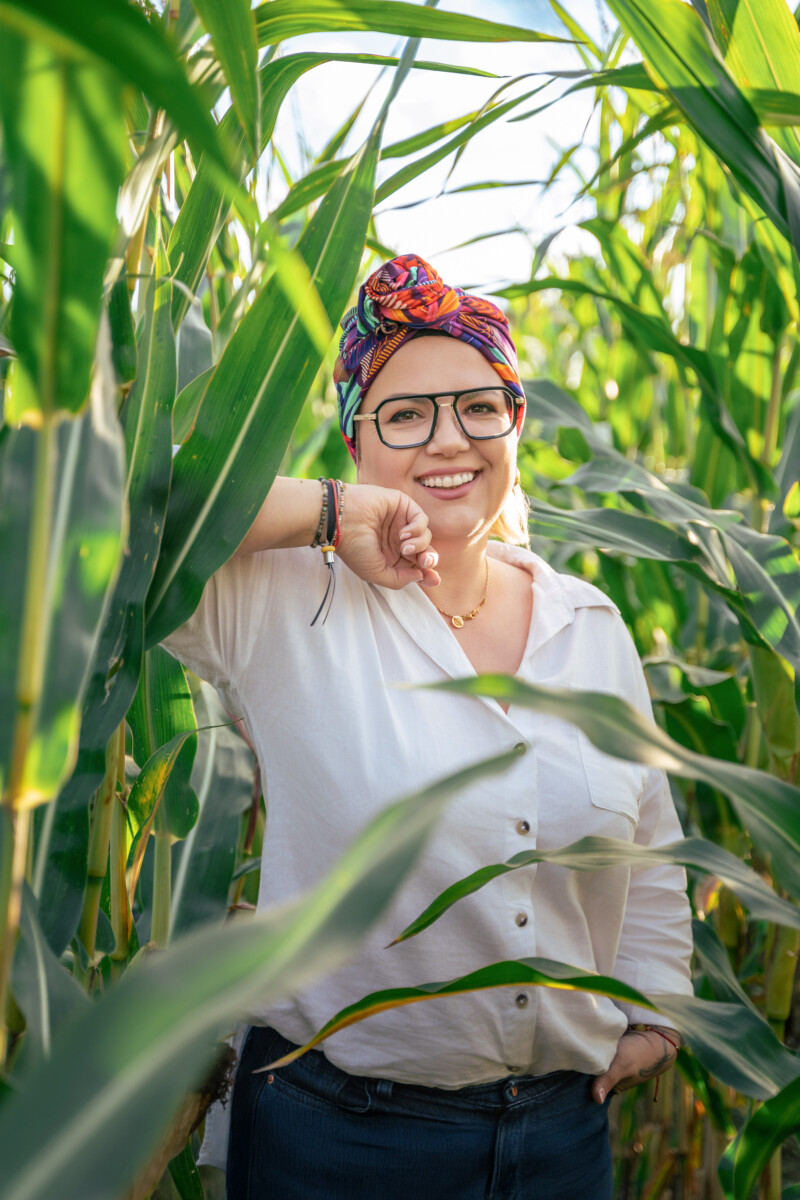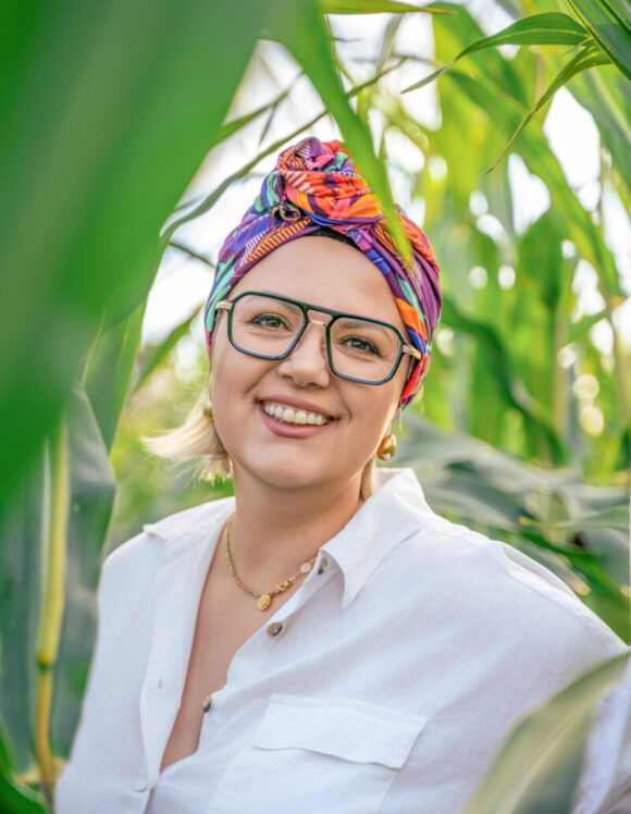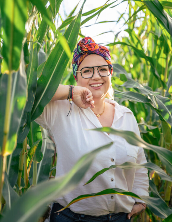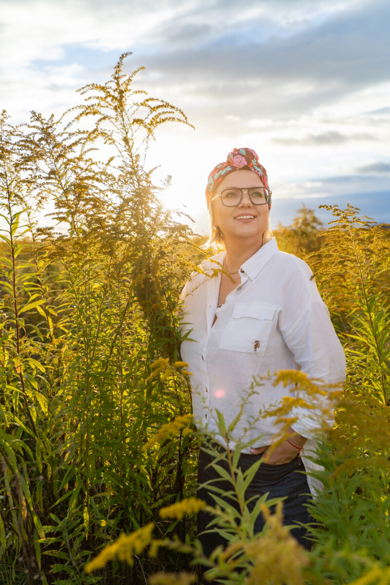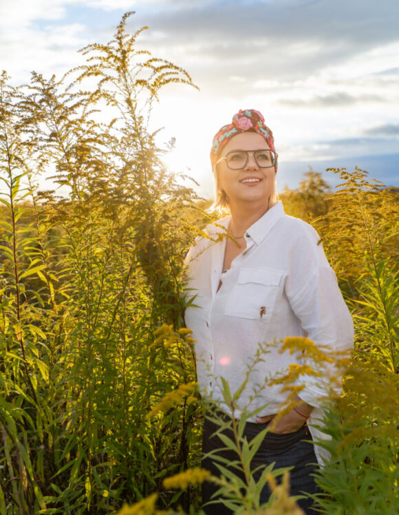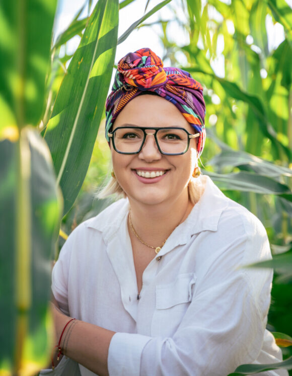 Turban uszyty z dzianiny wiskozowej z dodatkiem elastanu w kolorze głębokiego fioletu, ozdobiona kolorowym, roślinnym wzorem, który dodaje turbanowi wyjątkowego charakteru i subtelnej energii.