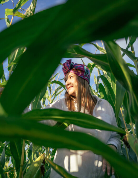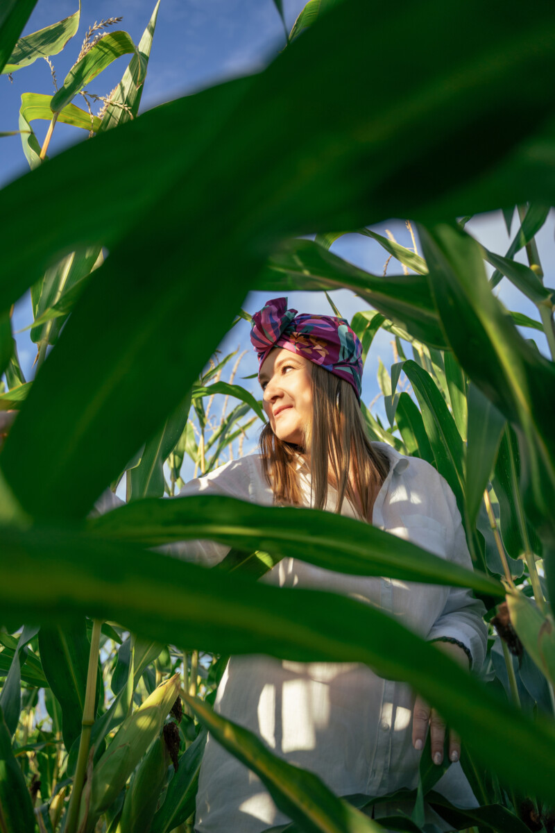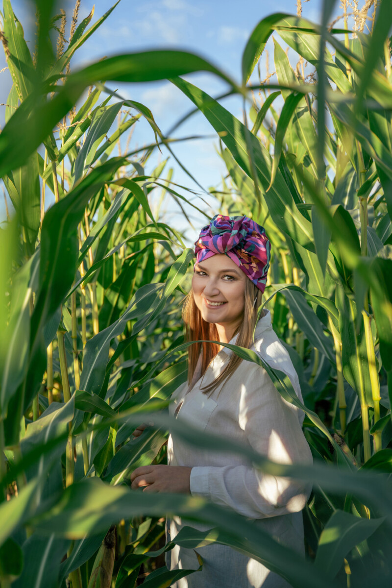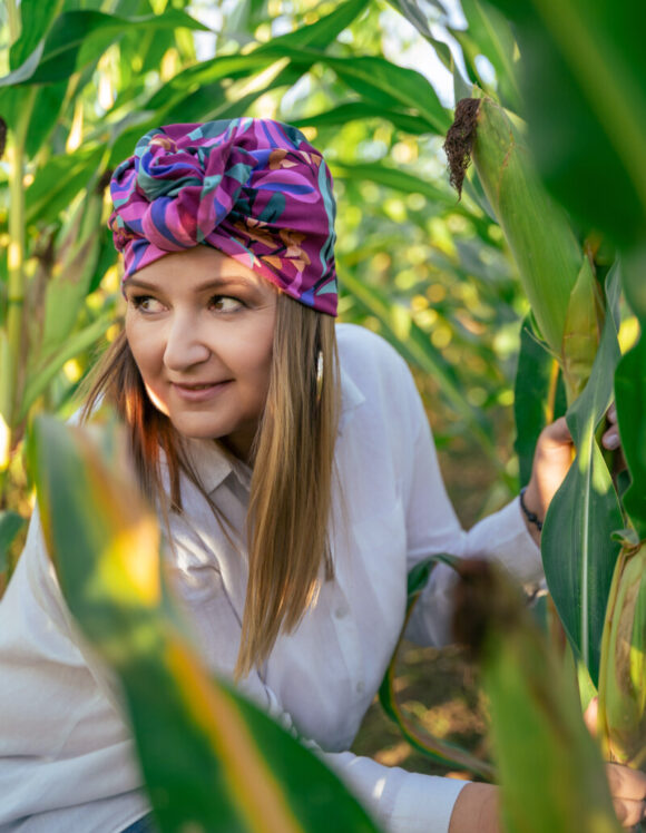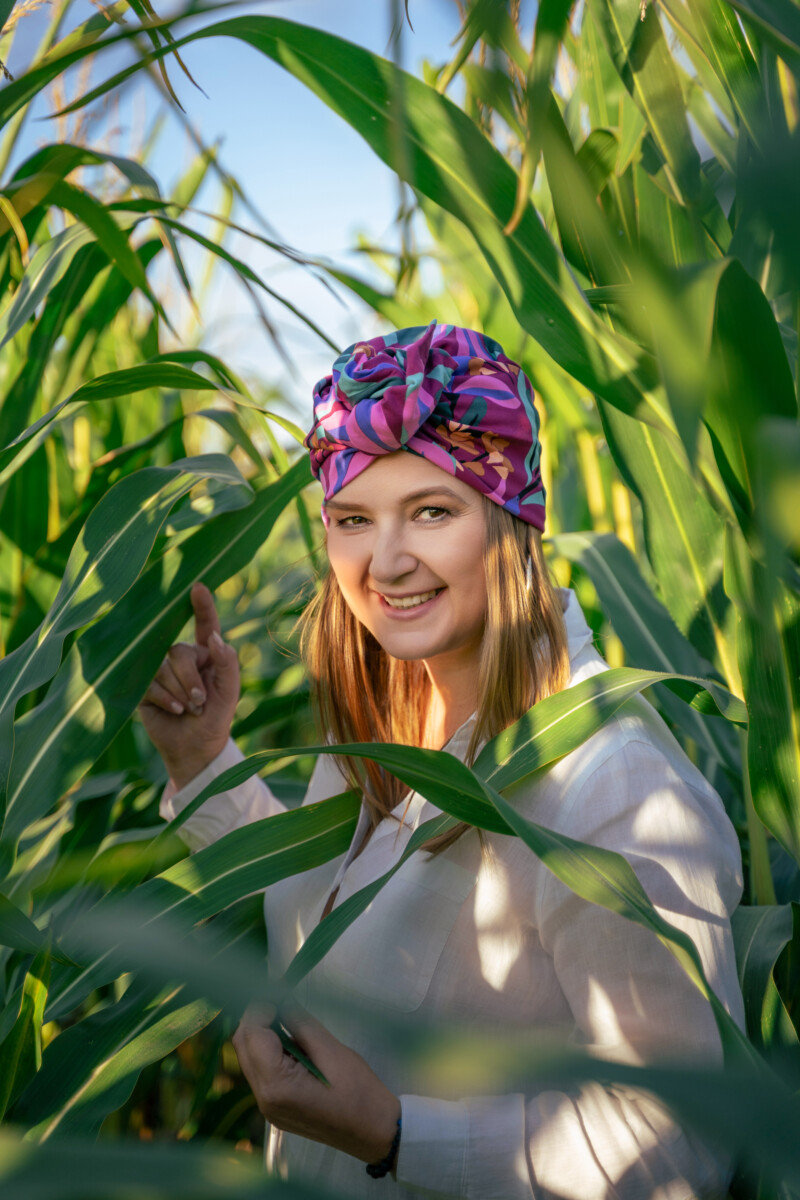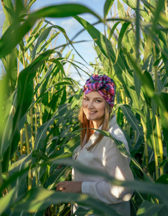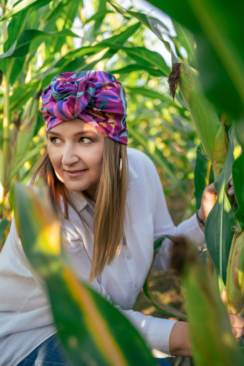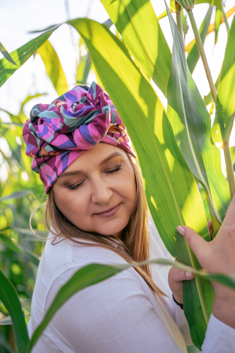 Turban uszyty z 100% bawełny wielokolorowej: dominuje intensywny odcień fuksji, przeplatany turkusowymi, zielonymi, granatowymi i musztardowymi akcentami w abstrakcyjnym wzorze