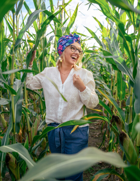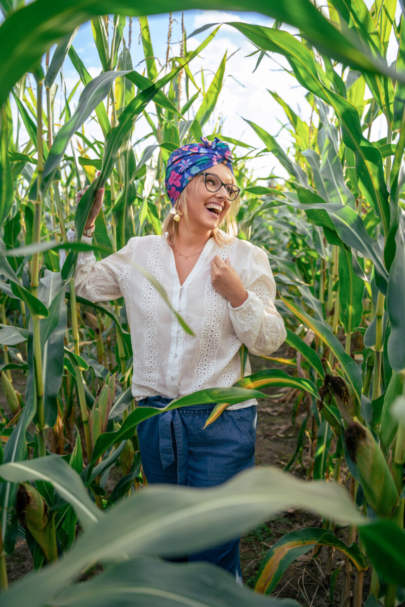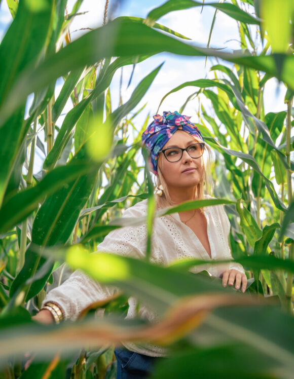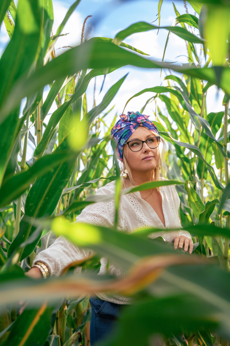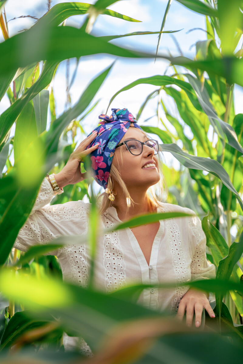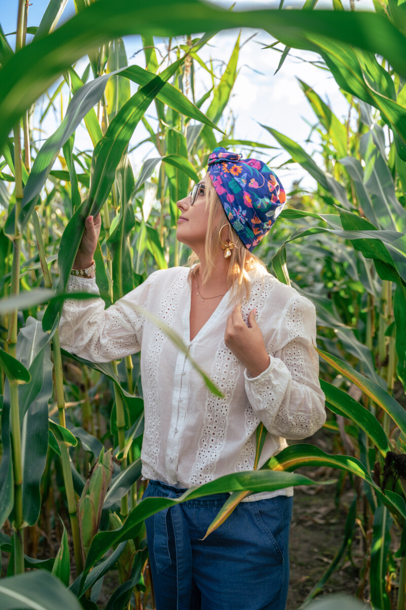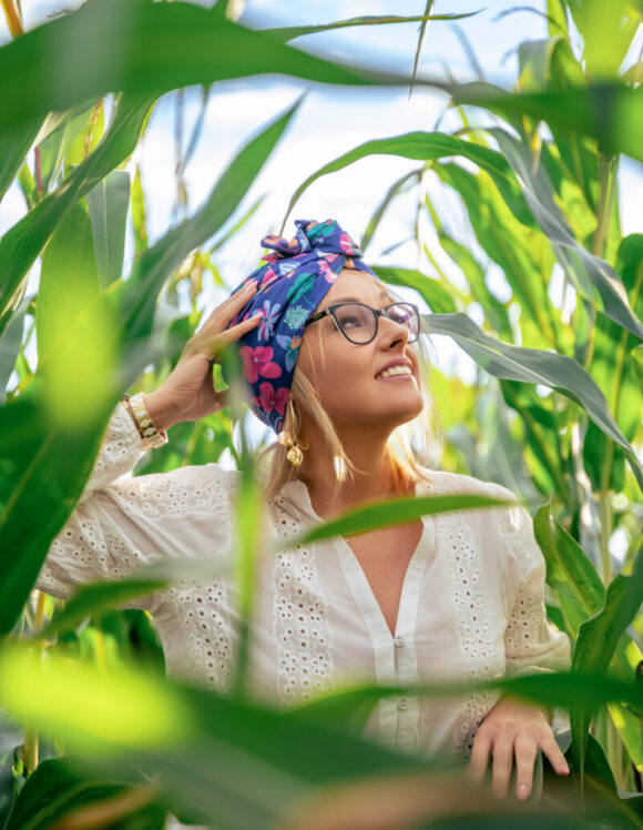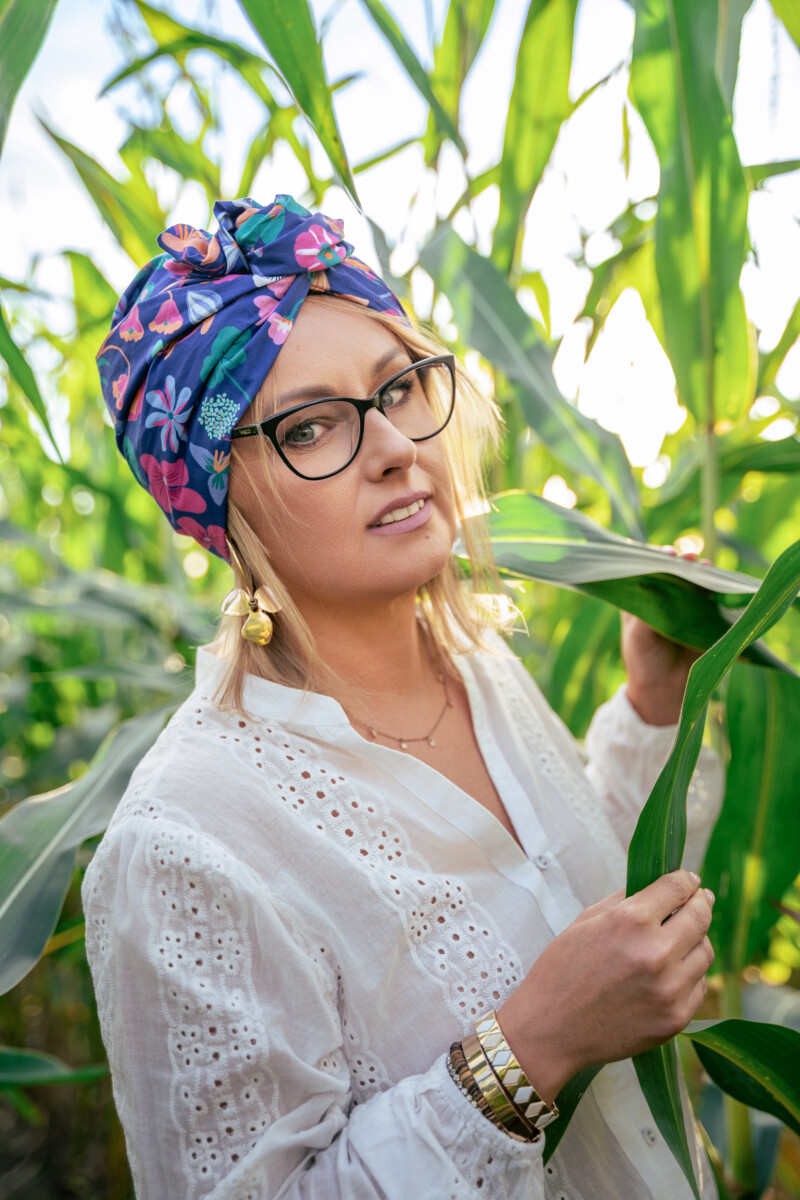 Turban uszyty z 100% bawełny. Wyróżnia się głębokim granatowo-indygo tłem z kwiatowymi motywami liści i abstrakcyjnych kształtów. Jaskrawe fiolety, róże, żółcie oraz zielone akcenty dodają mu energetycznego, letniego charakteru