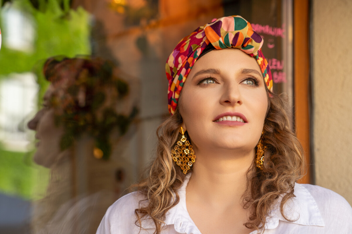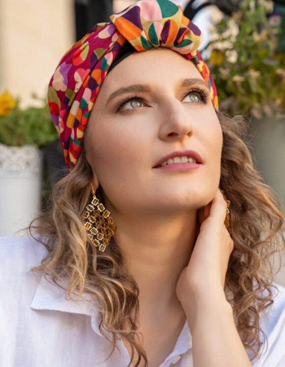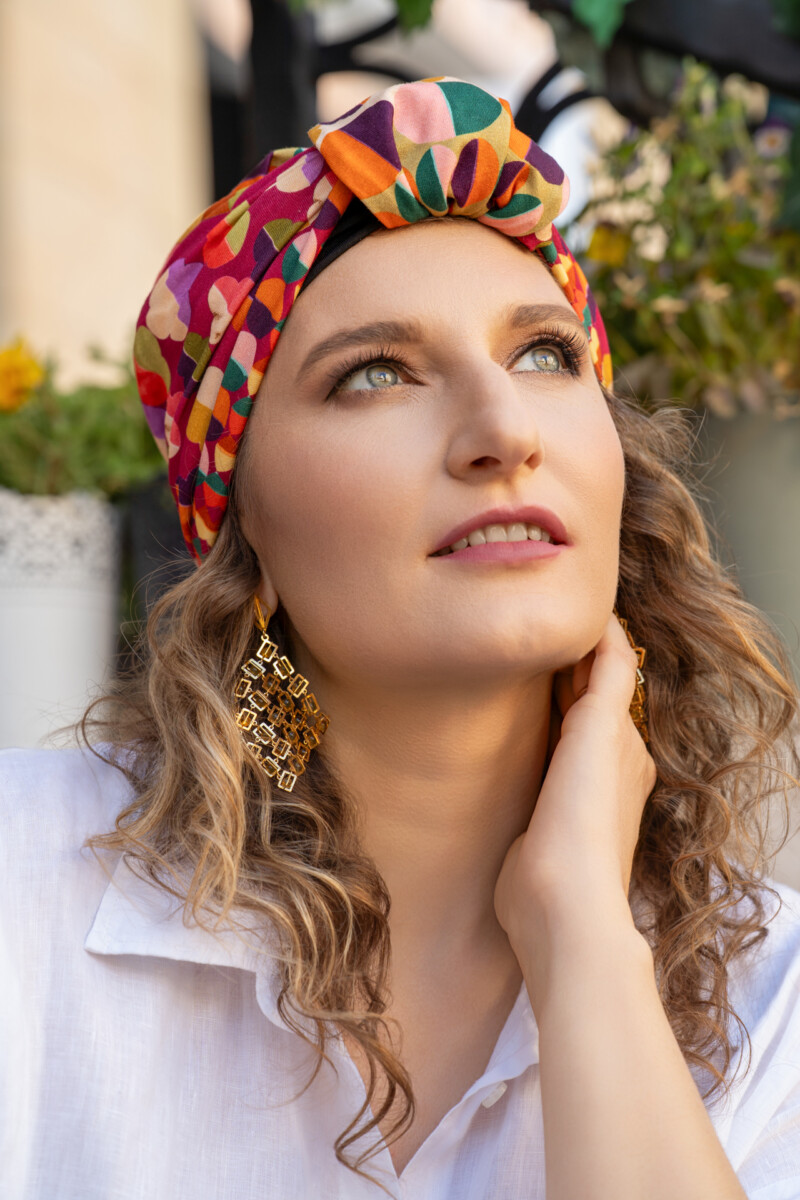 Dzianina wiskozowa z dodatkiem elastanu to lekki, elastyczny materiał, który doskonale dopasowuje się do sylwetki i zapewnia komfort noszenia. Ozdobiona regularnym wzorem półkoli w kolorach białym, pomarańczowym, czerwonym, granatowym i niebieskim – przyciąga wzrok i nadaje turbanowi energiczny, nowoczesny charakter. Użyta dzianina jest miękka i przewiewna, elastyczna, wyrazista.