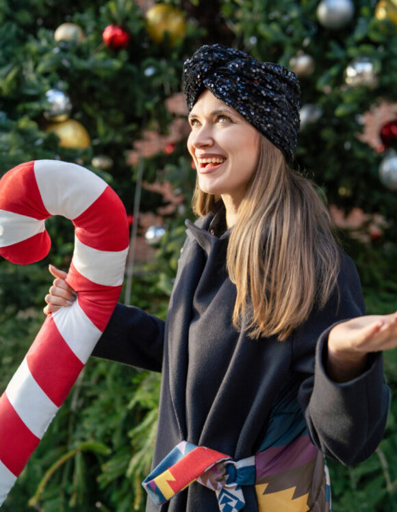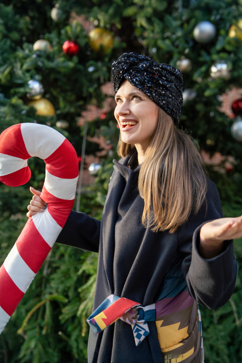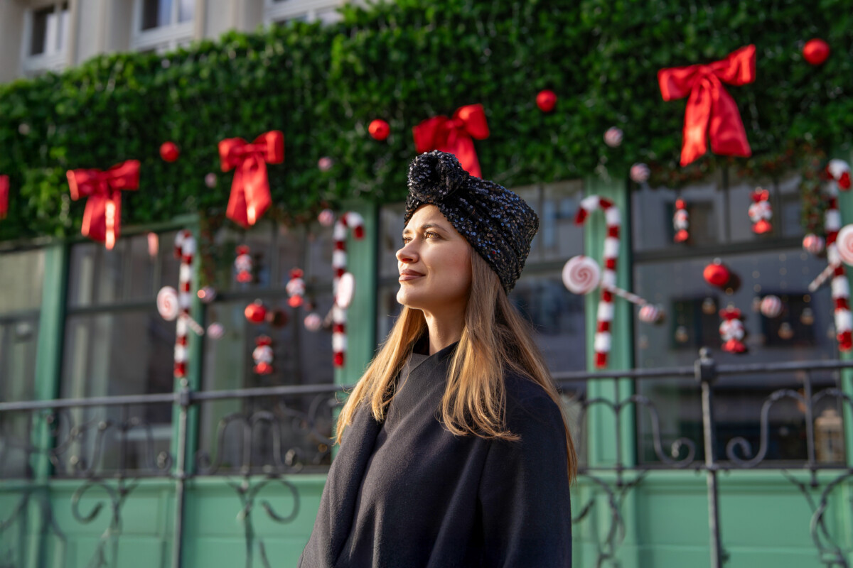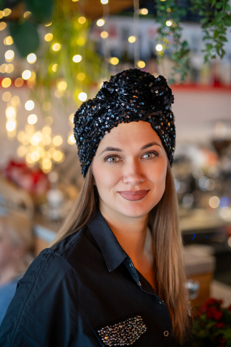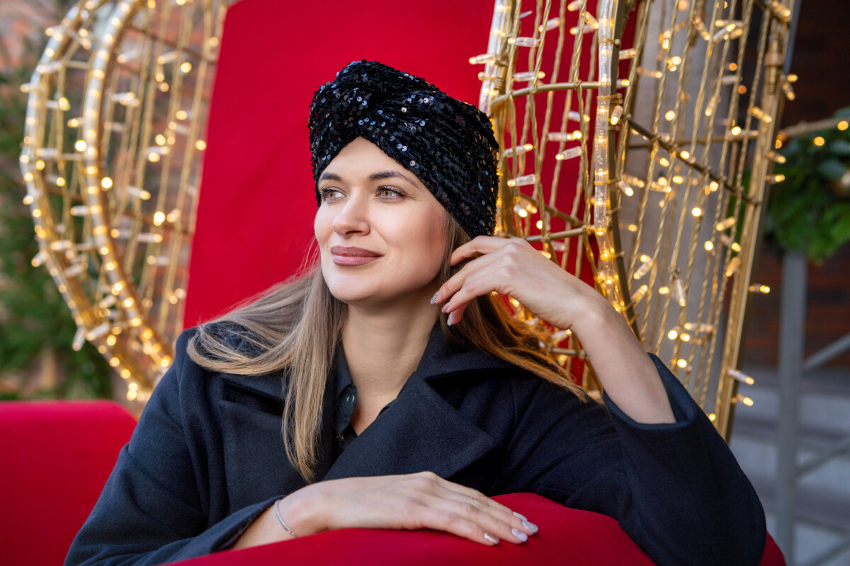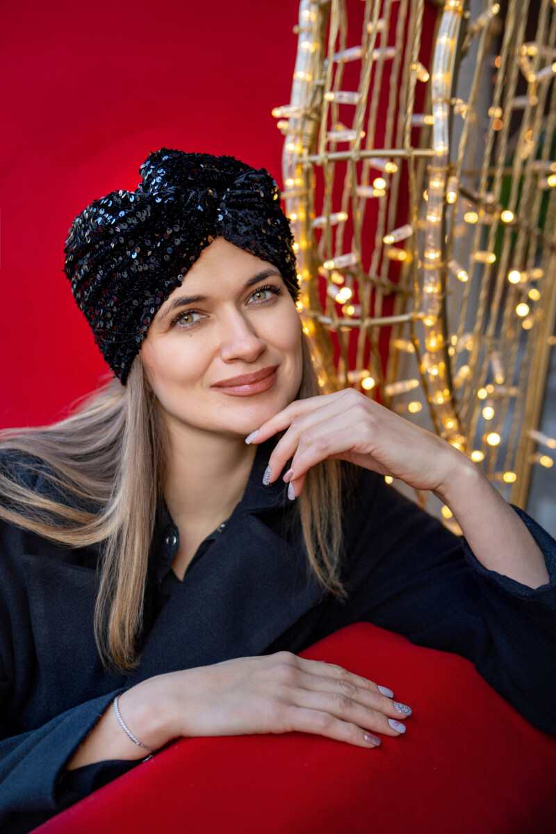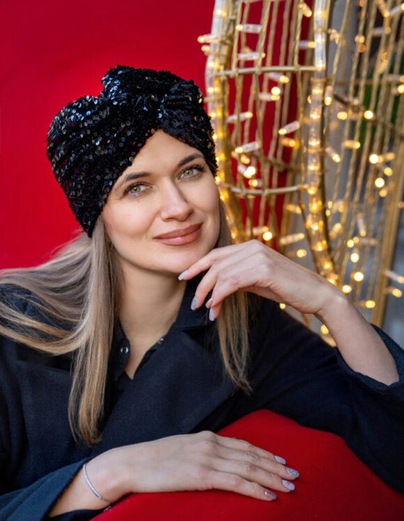 Czarny turban z cekinami – elegancja, która przyciąga spojrzenia.