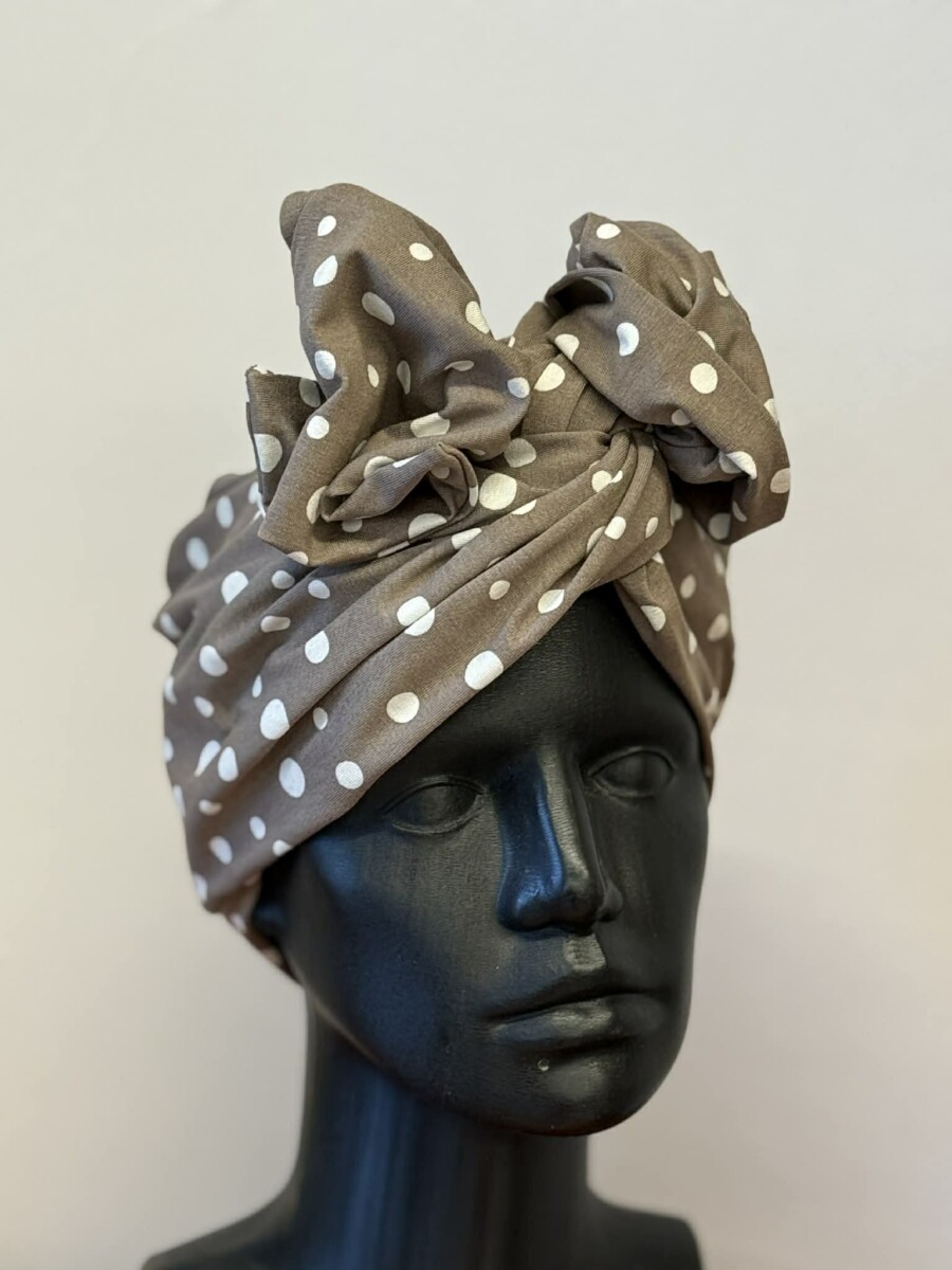Turban wyróżnia się klasycznym wzorem w groszki – równomiernie rozmieszczone białe kropki na beżowo-karmelowym tle. Artystycznie zawinięty w puszysty supeł z przodu, tworzy efekt kobiecy i ponadczasowy.