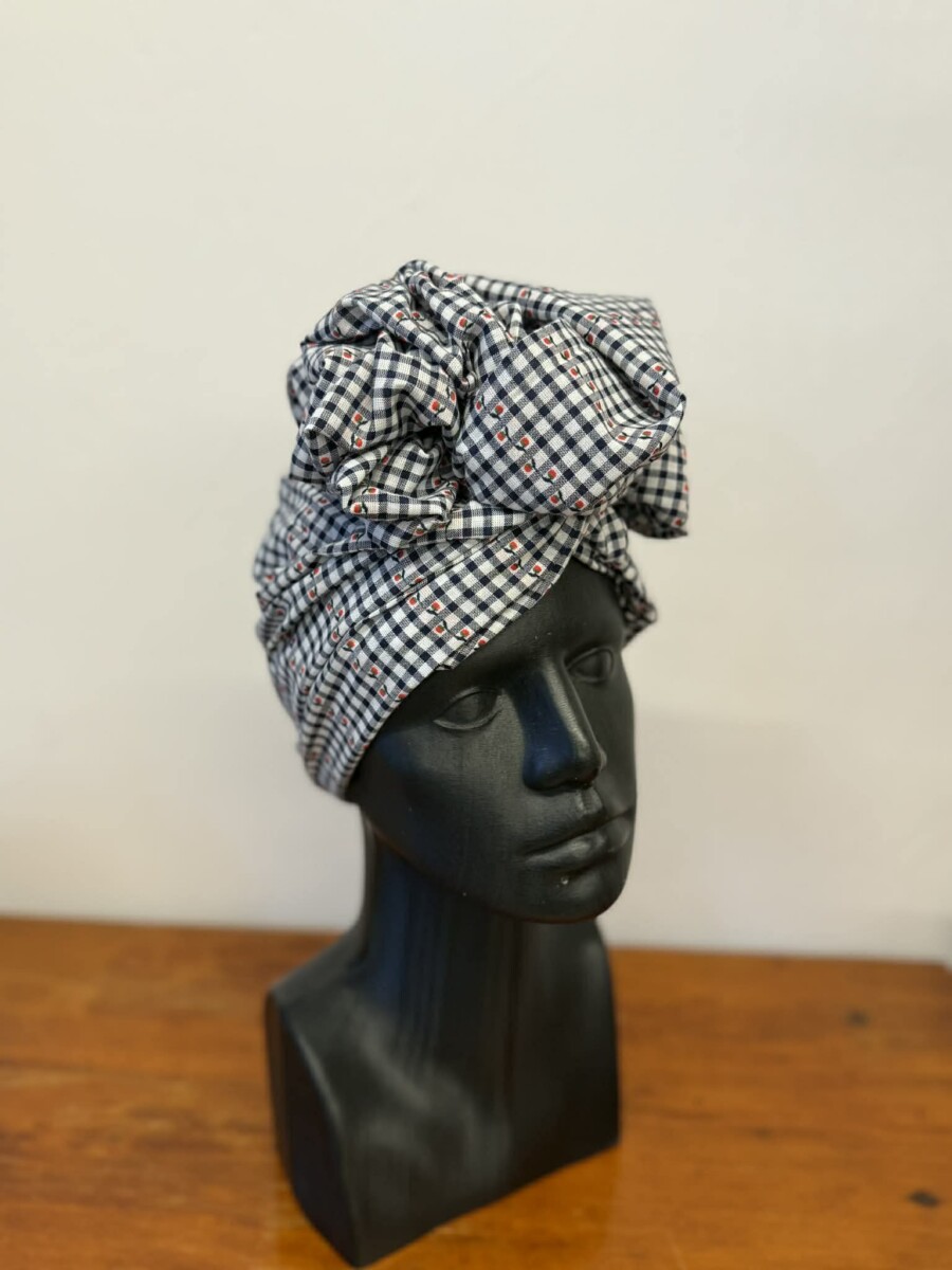 Turban w subtelnej kratce czarno-białej wyróżnia się delikatnym, klasycznym wzorem, który dodaje wyrafinowanego uroku bez przytłaczania stylizacji.